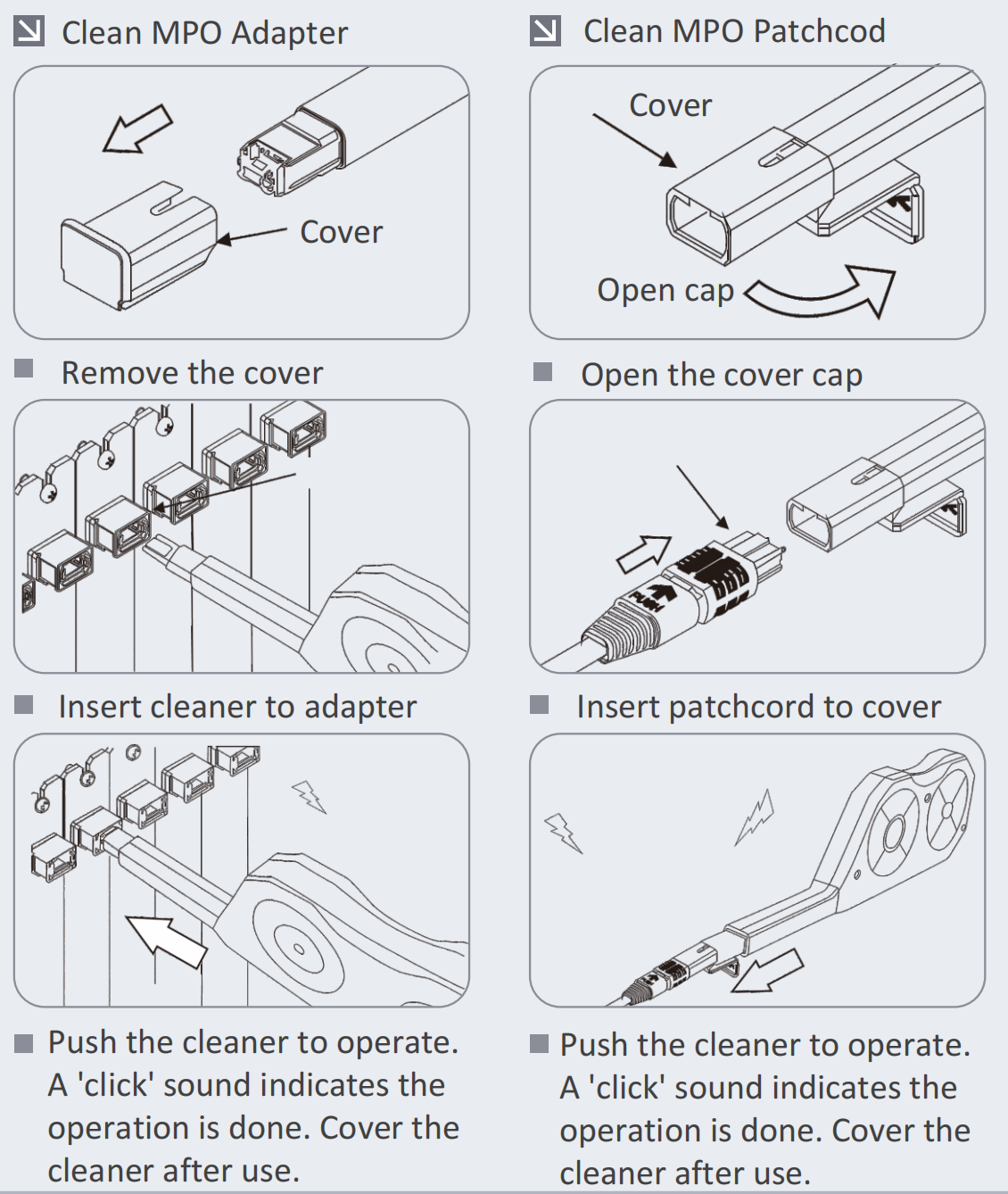 El FF-CLEP-MPO-T está especialmente diseñado para limpiar conectores MPO. Fabricado con un paño limpio de alta densidad sin alcohol, limpia eficazmente 12 núcleos a la vez. Limpia tanto conectores MPO macho como hembra. Su funcionamiento con una sola pulsación ofrece gran comodidad.